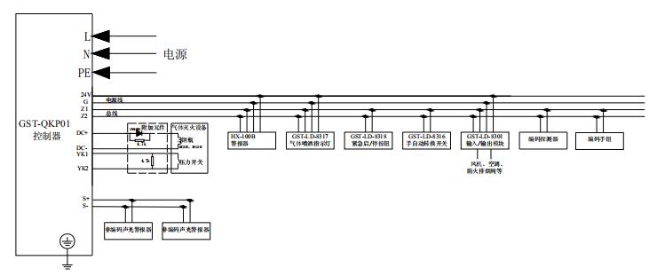 采用海灣成熟的總線技術實現與現場控制和報警設備的連接,緊急啟/停按鈕、用于指示噴灑的氣體噴灑指示燈、區域訊響器和手自動轉換開關等設備均可方便的連接到GST-QKP01上,布線簡單方便且配置靈活。