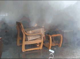 (實(shí)驗(yàn)畫面顯示,火災(zāi)發(fā)生后,獨(dú)立感煙探測器開始報(bào)警,簡易噴淋開始噴水)