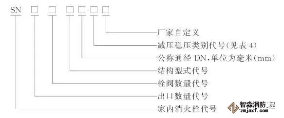 公稱通徑為65mm、雙出口雙閥、減壓穩壓類別代號為Ⅰ的室內消火栓型號可表示為:SNSSW65-Ⅰ。