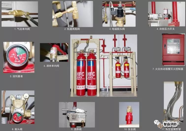 滅火系統主要由氣流單向閥、低通高阻閥、電磁瓶頭閥、自鎖壓力開關、溶濟量表、液體單向閥、氣體報警滅火控制器、瓶頭閥、選擇閥、安全閥、高壓金屬軟管等設備組成。