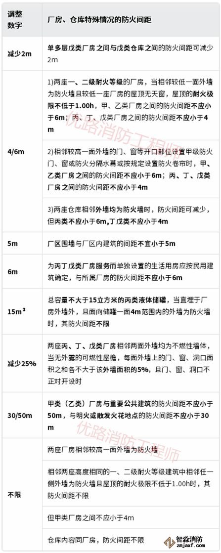 5)單、多層戊類廠房之間及與戊類倉庫的防火間距可按表的規(guī)定減少2m。