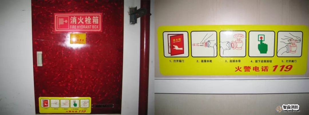 設置要求:在消火栓箱門中上部應設置自發光式“消火栓箱”標牌,在中下部張貼操作方法圖例,圖例大小420×140mm。