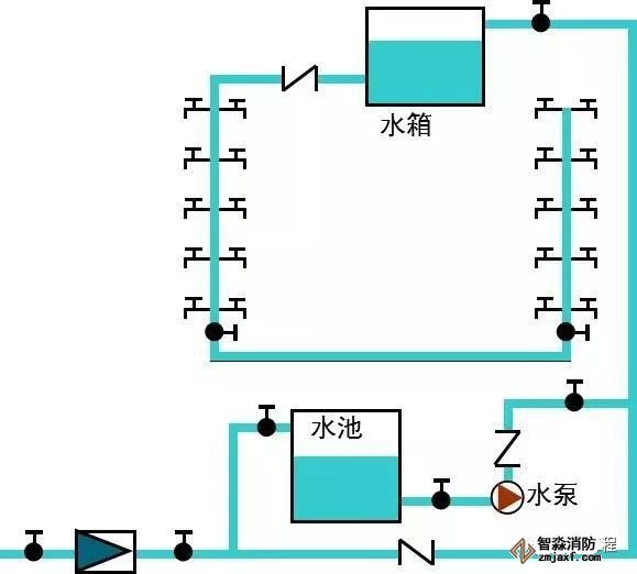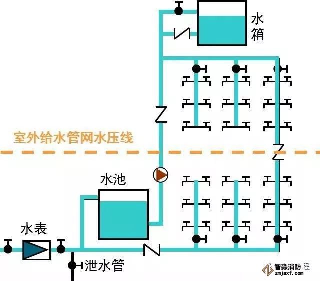 (3)、設有貯水池、水箱和水泵的給水方式