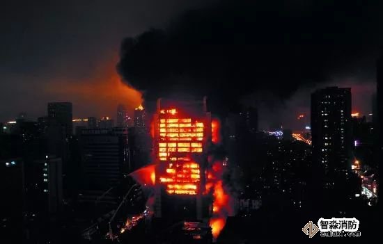 酒店的起火原因與央視大樓相似,都是因煙花掉落建筑外表后,引起外墻裝飾及保溫材料燃燒所致。隨后在煙囪效應的作用下,火勢迅速蔓延、擴大,致使建筑外窗破碎,引燃室內可燃物,形成大面積立體燃燒。所幸,消防官兵趕到后,及時通過啟動應急廣播、現場搜救等方式,將酒店內全部人員疏散至安全地帶,無任何人員傷亡。