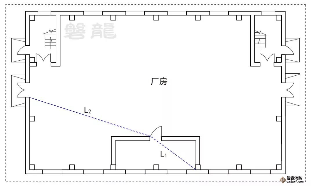 2、廠房倉庫同樣不應(yīng)采用嵌套(穿套)設(shè)置的方式,確因功能需要,嵌套(穿套)設(shè)置的房間不應(yīng)超過一級(jí),疏散距離應(yīng)按人員行走的直線距離計(jì)算,在圖示6的廠房中,示例房間內(nèi)任一點(diǎn)至安全出口的直線距離,應(yīng)為L1+L2。