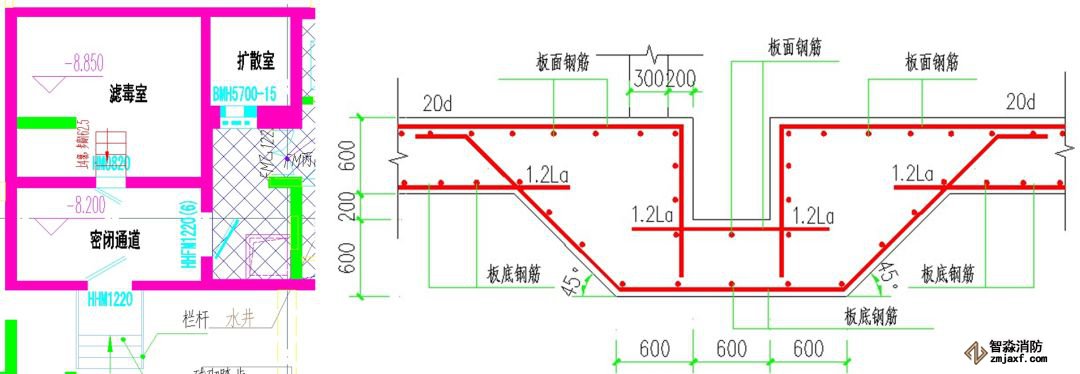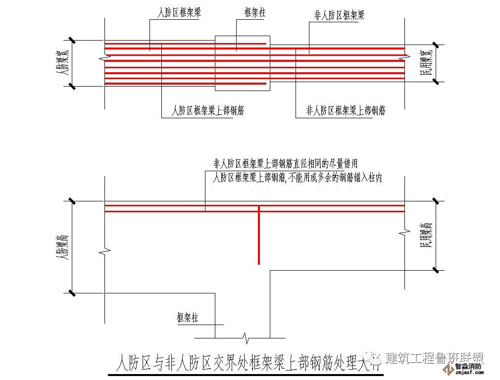 1)人防區(qū)內(nèi)梁板配筋圖紙一般由人防院設(shè)計,但模板關(guān)系(如洞口定位,梁定位、標高)由民用院模板圖表達,所以梁板配筋應(yīng)結(jié)合兩院圖紙施工。
