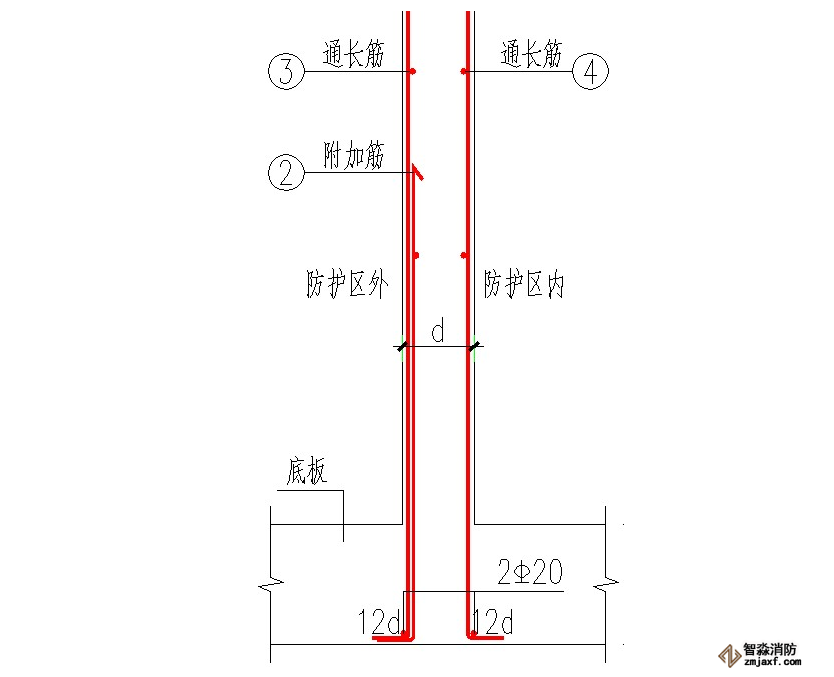 人防墻體鋼筋:豎向鋼筋應(yīng)伸至板頂部,未滿足者,應(yīng)加插倒U形鋼筋,鋼筋規(guī)格同原設(shè)計,長度為搭接長度Lld。