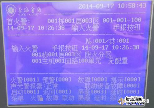 答:從五個方面回答(1.報警類型-火警;2.報警部位-1棟1層3區防火分區;3.報警時間-2014年9月17日10點26分38秒;4.報警原因-手動報警按鈕報火警;5.處理方法)注:需要從液晶顯示屏上把具體內容代入并表達出來。