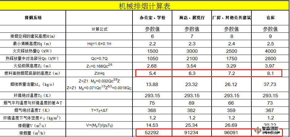 通過反算可知,表4.6.3中的排煙量數據,應該是按儲煙倉高度為10%房間凈高時的結果(以下為有噴淋情況的反算推算表),儲煙倉高度為房間凈高的10%,是規范要求的機械排煙最小儲煙倉厚度,也是燃料面到煙層底部高度(Z)的最大高度,由下表公式可知,相同條件下,煙層底部高度(Z)最大值時對應的排煙量即最大排煙量,也就是說,表4.6.3所列的排煙量為最大排煙量,任何其他計算條件下的排煙量都不可能大于這個排煙量,再規定計算值不應小于表4.6.3中的數值無意義。
