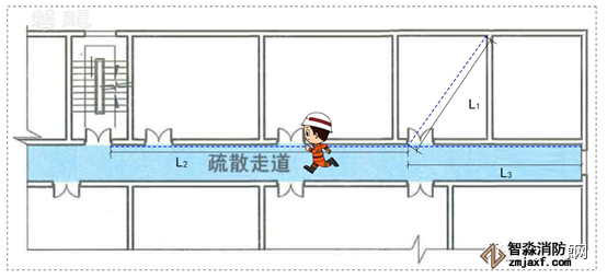 1、有些特殊情況下,房間并沒有向疏散走道開設疏散門(房間用作其他功能空間或通過其他疏散走道疏散),就可能出現L3較大的情況(示例4),這時應予控制。本示例中,L3可以參照房間內任一點至房間直通疏散走道的疏散門的直線距離(L1)控制。