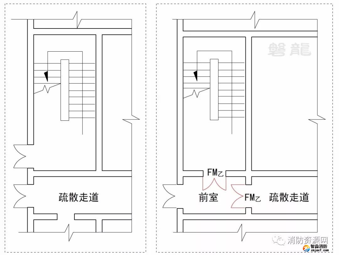 三、防煙樓梯間在首層直通室外確有困難時(shí),可在首層采用擴(kuò)大的防煙樓梯間前室。