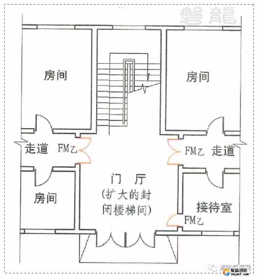 樓梯間的首層可將走道和門廳等包括在樓梯間內(nèi)形成擴(kuò)大的封閉樓梯間,但應(yīng)采用乙級防火門等與其他走道和房間分隔。