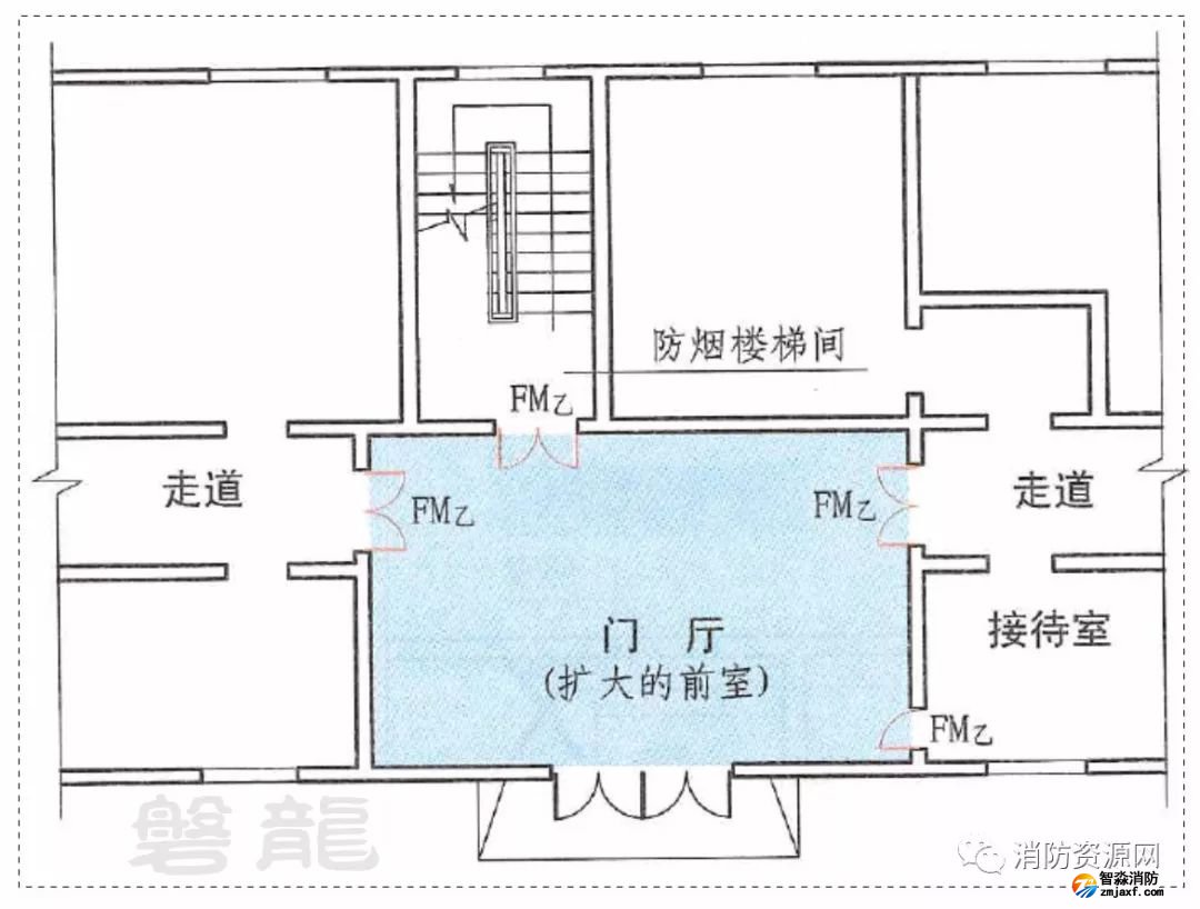 樓梯間的首層可將走道和門廳等包括在樓梯間前室內(nèi)形成擴(kuò)大的前室,但應(yīng)采用乙級防火門等與其他走道和房間分隔。