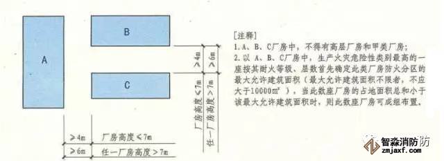 除高層廠房和甲類廠房外,其他類別的數(shù)座廠房占地面積之和小于本規(guī)范第3.3.1條規(guī)定的防火分區(qū)最大允許建筑面積(按其中較小者確定,但防火分區(qū)的最大允許建筑面積不限者,不應(yīng)大于10000㎡)時,可成組布置。當(dāng)廠房建筑高度不大于7m時,組內(nèi)廠房之間的防火間距不應(yīng)小于4m;當(dāng)廠房建筑高度大于7m時,組內(nèi)廠房之間的防火間距不應(yīng)小于6m。