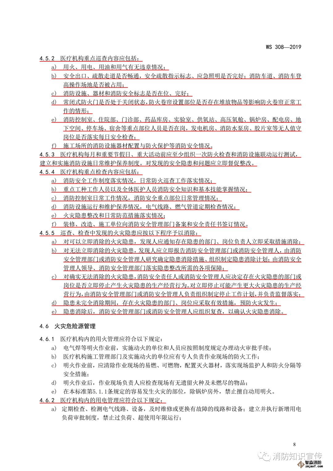 4.8.2 醫療機構每年應組織管理人員開展一次消防安全教育培訓,培訓內容除包括 4.8.1 規定的內容外,還包括: