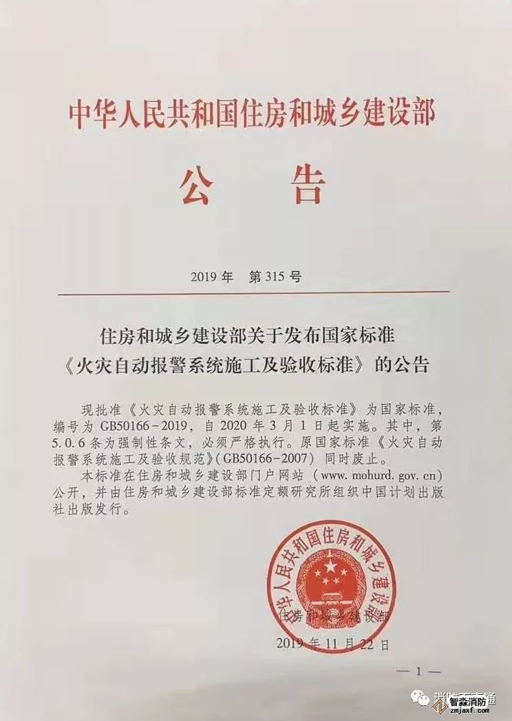 現批準《火災自動報警系統施工及驗收標準》為國家標準,編號為GB50166-2019,自2020年3月1日起實施。其中,第5.0.6條為強制性條文,必須嚴格執行。原國家標準《火災自動報警系統施工及驗收規范》(GB50166-2007)同時廢止。