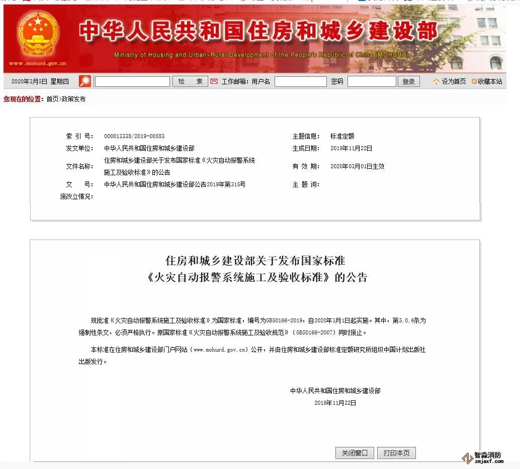 近日,住房和城鄉建設部發布公告,批準《火災自動報警系統施工及驗收標準》為國家標準,編號為GB50166-2019,自2020年3月1日起實施。原國家標準《火災自動報警系統施工及驗收規范》(GB50166-2007)同時廢止。