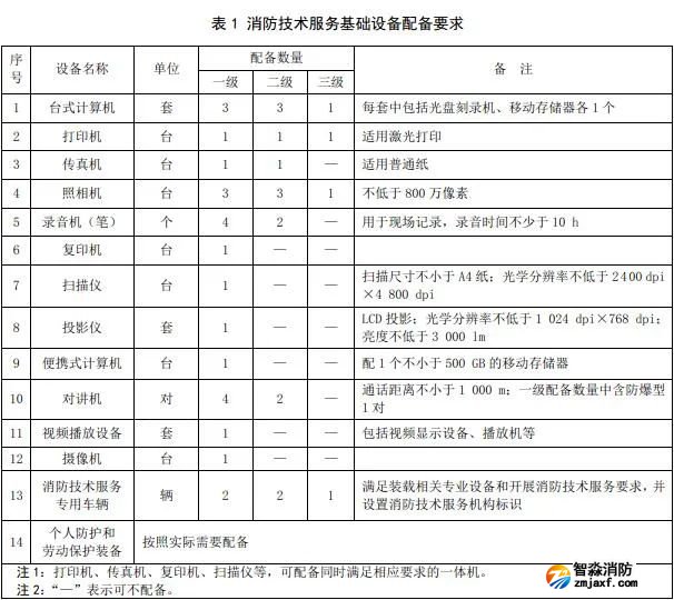 消防技術服務基礎設備為各類消防技術服務機構應配備的通用設備,應符合消防技術服務數據處理、調查取證和從業人員個人防護的要求,設備的種類和數量至少應滿足下表1的要求。