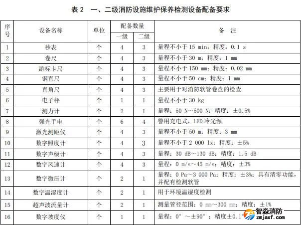 一級、二級消防設施維護保養檢測設備用于建筑消防設施的維護、保養和檢測,其設備配備的種類和數量至少應滿足下表2的要求。