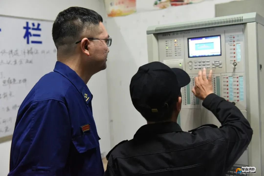消防值守人員演示著火時消防控制室消防聯動控制器如何報警。