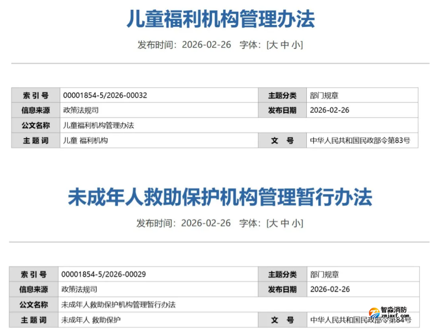 近日,民政部公布新修訂的《兒童福利機構管理辦法》和《未成年人救助保護機構管理暫行辦法》。兩個辦法均自2026年4月1日起施行,并在內部管理章節明確機構安全管理主體責任,提出完善消防安全、應急管理等方面的具體措施和監管要求。
