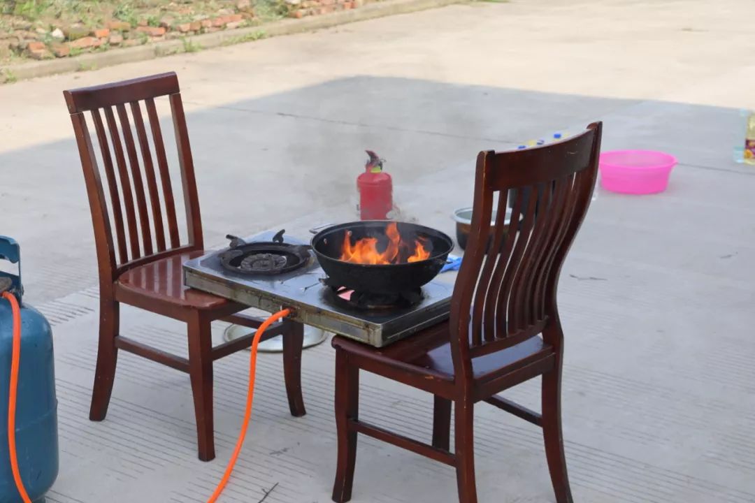 首先,消防員將食用油倒入鍋內進行加熱,充分加熱后點燃。