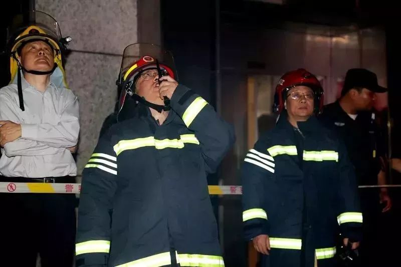 21時25分許,周詳總隊長、梁新國政委到達現場。根據災情現狀,周詳總隊長要求:組織到場力量全力搜救被困人員;充分利用固定消防設施進行內攻滅火堵截;消防車停靠、連接大樓水泵接合器,確保建筑內部消防管網壓力、流量不足情況下,滿足前方滅火需要;調派70米以上舉高車到場壓制外墻蔓延火災;參戰指戰員加強防護、編組作戰,確保不發生人員傷亡。