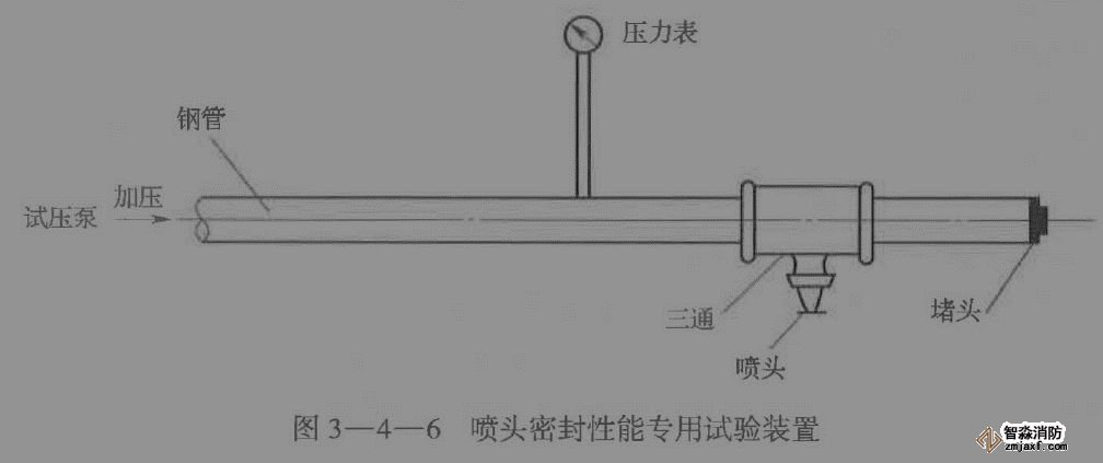 3)試驗以噴頭無滲漏、無損傷判定為合格。累計兩只以及兩只以上噴頭試驗不合格的,不得使用該批噴頭。(試壓泵、壓力表、秒表)