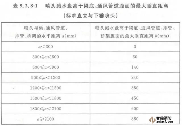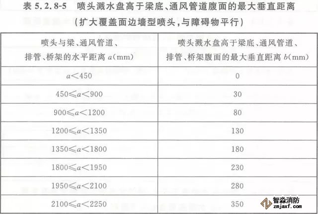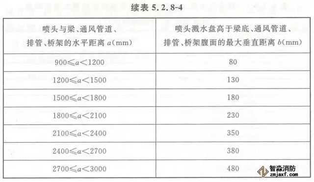 5.2.8 當噴頭濺水盤高于附近梁底或高于寬度小于1.2m的通風管道、排管、橋架腹面時,噴頭濺水盤高于梁底、通風管道、排管、橋架腹面的最大垂直距離應符合表5.2.8-1~表5.2.8-9的規定(見圖5.2.8)。
