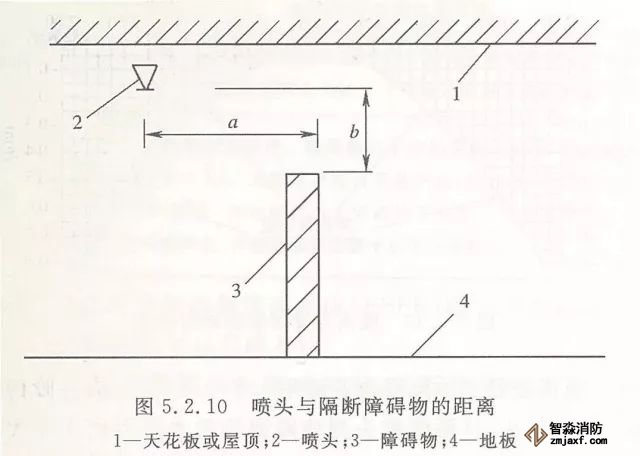 5.2.10 當噴頭安裝在不到頂的隔斷附近時,噴頭與隔斷的水平距離和最小垂直距離應符合表5.2.10的規定(見圖5.2.10)。