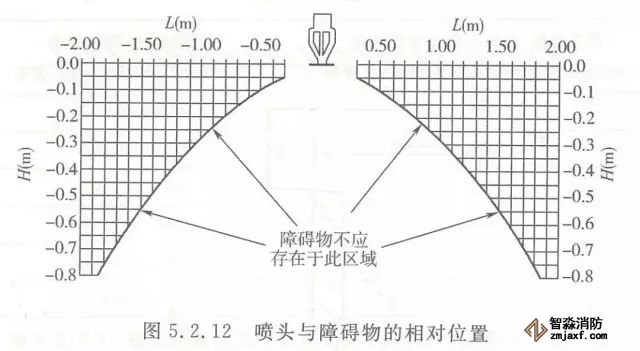 5.2.12 頂板處的障礙物與任何噴頭的相對位置,應使噴頭到障礙物底部的垂直距離(H)以及到障礙物邊緣的水平距離(L)滿足圖5.2.12所示的要求。當無法滿足要求時,應滿足下列要求之一。