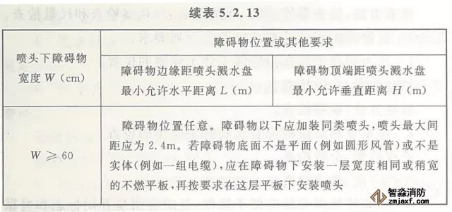 5.2.13 早期抑制快速響應(ESFR)噴頭與噴頭下障礙物的距離應滿足本規范圖5.2.12所示的要求。當無法滿足要求時,噴頭下障礙物的寬度與位置應滿足本規范表5.2.13的規定。