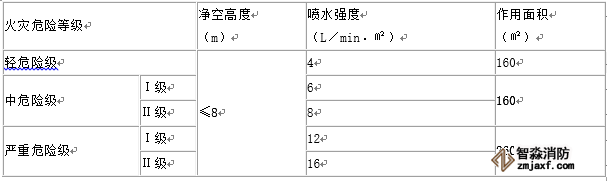 噴頭的布置應(yīng)符合中危險(xiǎn)級Ⅰ級場所,作用面積應(yīng)符合: