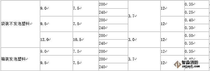 注:1.無包裝的塑料橡膠視同紙袋、塑料袋包裝。 2.貨架內(nèi)置噴頭應(yīng)采用與頂板下噴頭相同的噴水強(qiáng)度,用水量應(yīng)按開放6只噴頭確定。 |
