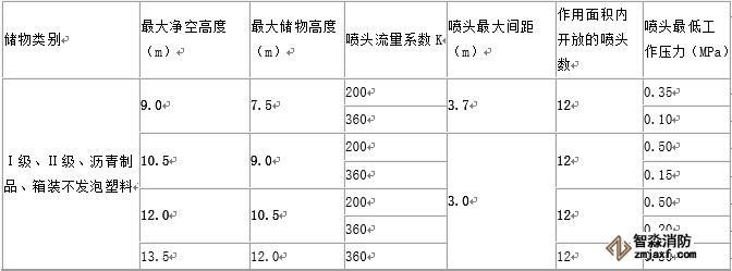 4.采用早期抑制快速響應(yīng)噴頭的倉庫系統(tǒng)設(shè)計(jì)基本參數(shù)不應(yīng)低于下表的規(guī)定。