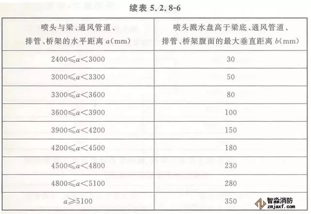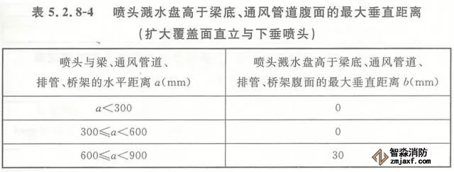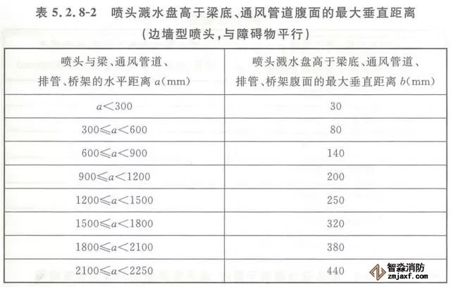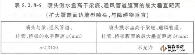 5.2.8 當(dāng)噴頭濺水盤高于附近梁底或高于寬度小于1.2m的通風(fēng)管道、排管、橋架腹面時,噴頭濺水盤高于梁底、通風(fēng)管道、排管、橋架腹面的最大垂直距離應(yīng)符合表5.2.8-1~表5.2.8-9的規(guī)定(見圖5.2.8)。