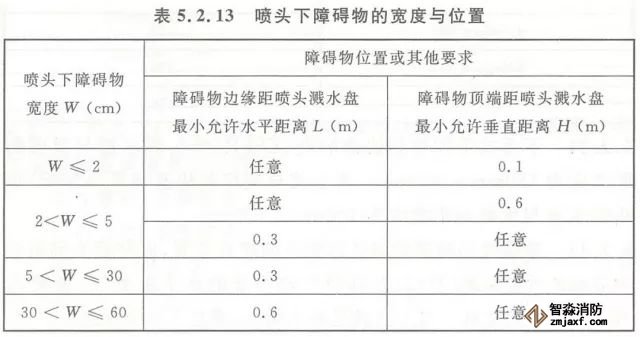 5.2.13 早期抑制快速響應(yīng)(ESFR)噴頭與噴頭下障礙物的距離應(yīng)滿足本規(guī)范圖5.2.12所示的要求。當(dāng)無法滿足要求時,噴頭下障礙物的寬度與位置應(yīng)滿足本規(guī)范表5.2.13的規(guī)定。