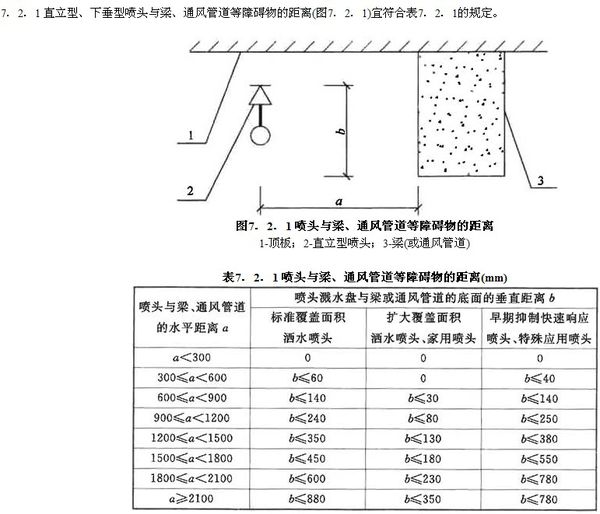 直立型灑水噴頭濺水盤與頂板的距離應(yīng)為75mm~150mm,并應(yīng)符合下列規(guī)定:1 當在梁或其他障礙物底面下方的平面上布置灑水噴頭時,濺水盤與頂板的距離不應(yīng)大于300mm,同時濺水盤與梁等障礙物底面的垂直距離應(yīng)為25mm~100mm。2 當在梁間布置灑水噴頭時,灑水噴頭與梁的距離應(yīng)符合本規(guī)范第7.2.1條的規(guī)定。確有困難時,濺水盤與頂板的距離不應(yīng)大于550mm。梁間布置的灑水噴頭,濺水盤與頂板距離達到550mm仍不能符合本規(guī)范第7.2.1條的規(guī)定時,應(yīng)在梁底面的下方增設(shè)灑水噴頭。3 密肋梁板下方的灑水噴頭,濺水盤與密肋梁板底面的垂直距離應(yīng)為25mm~100mm。