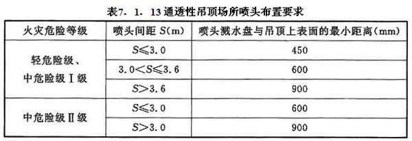 裝設(shè)網(wǎng)格、柵板類通透性吊頂?shù)膱鏊?,當通透面積占吊頂總面積的比例大于70%時,噴頭應(yīng)設(shè)置在吊頂上方,并應(yīng)符合下列規(guī)定:1 通透性吊頂開口部位的凈寬度不應(yīng)小于10mm,且開口部位的厚度不應(yīng)大于開口的最小寬度;2 噴頭間距及濺水盤與吊頂上表面的距離應(yīng)符合表7.1.13的規(guī)定。
