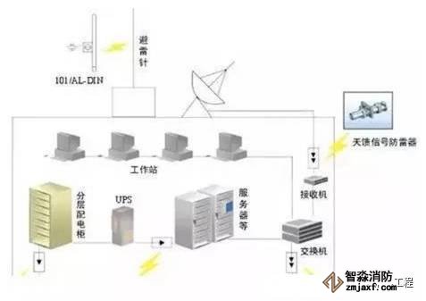 感應雷防護措施是限制、阻塞雷電脈沖沿電源線或數據、信號線進入設備,從而保護建筑物內各類電器設備的安全。內部防雷主要由浪涌保護器(SPD防雷器)、屏蔽系統、等電位連接系統、共用接地系統、合理布線系統等組成。安裝防雷器是分流感應雷電流和限制浪涌過電壓的有效措施,可分為電源防雷、信號防雷和天饋防雷。