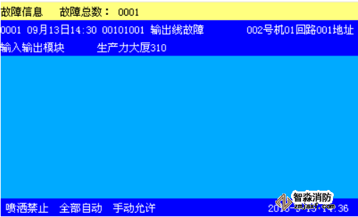 對于火災報警系統已登錄的部位,當出現現場總線設備內部故障(探測器故障),設備與底座接觸不良、設備底座與總線接觸不良、信號線施工不合格(通訊故障),模塊的24V電源未接、輸入模塊的輸入信號線或者24V線斷路、輸出模塊反饋信號或者24V線短路、斷路、輸出模塊控制線的短路、斷路(輸出線故障)等故障時,火災報警控制器將發出故障聲、光報警,此時面板上黃色故障指示燈點亮,液晶屏上顯示故障總數、序號和部位的編號、類型、報警時間及安裝位置(如下圖),打印機及歷史記錄將記錄相關的故障信息。